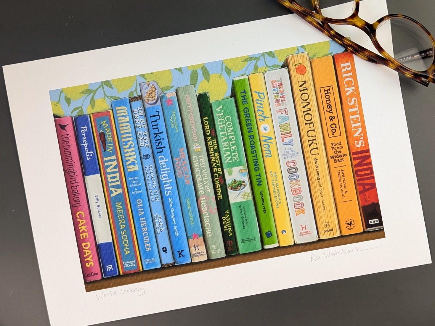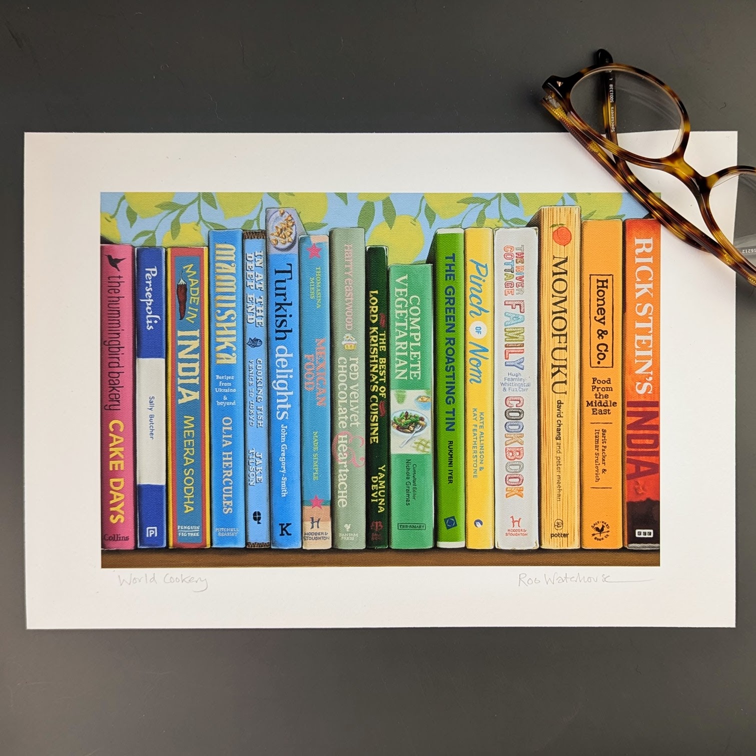 This image is a detail of one of my original Shelf-Portrait oil paintings ‘Every Grain of Rice‘, showing a packed full shelf of colourful cookery books with food inspiration from all around the world. A fabulous way to brighten up your kitchen! Available here as an A4 Fine art Print.