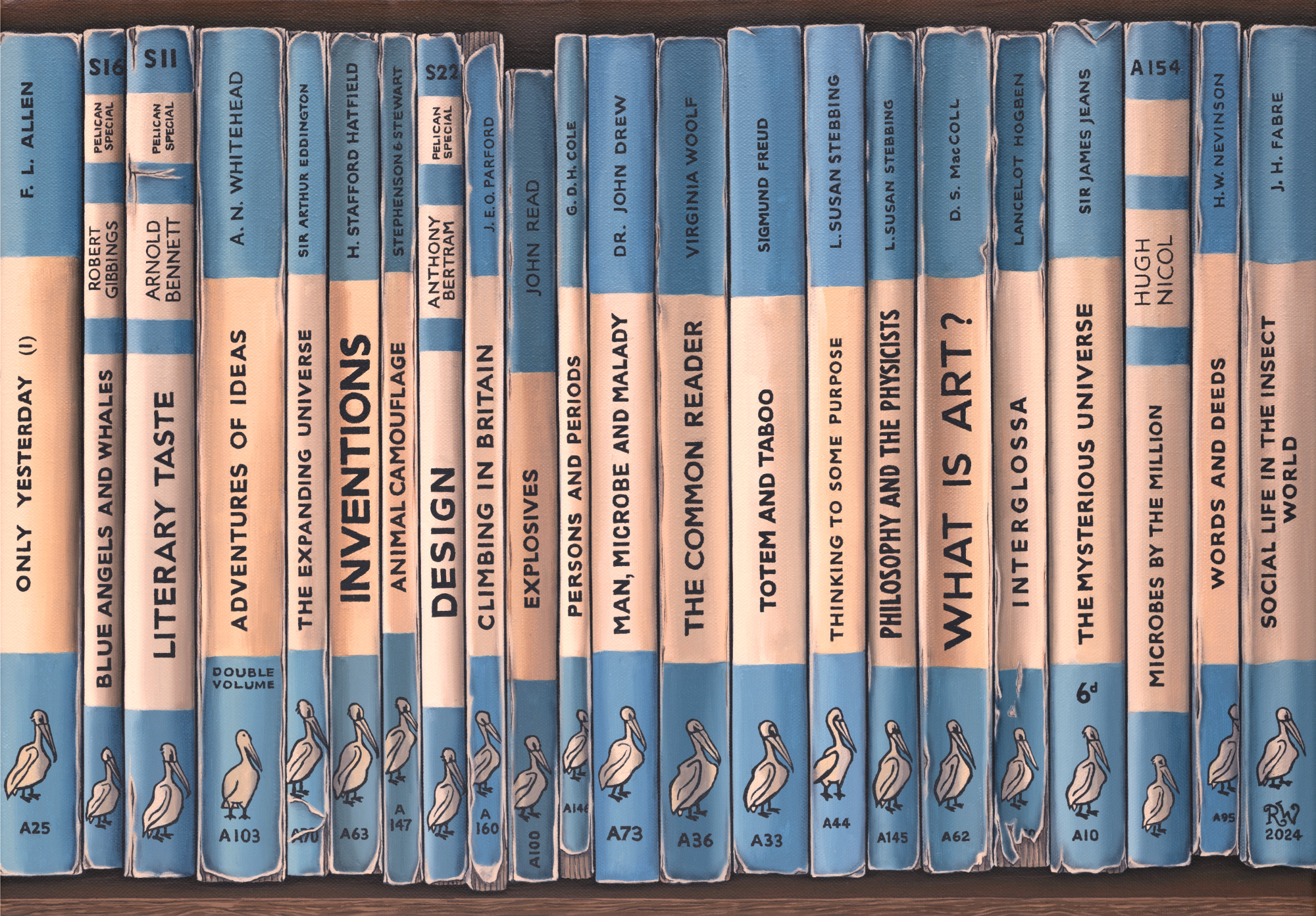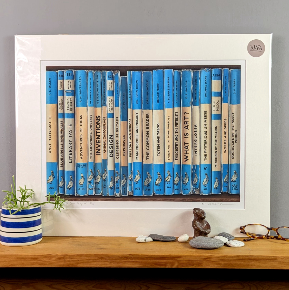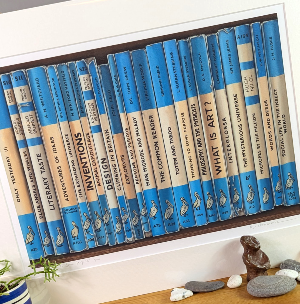 This Pelican Paperbacks Limited Edition print of Roo’s original oil painting ‘Thinking To Some Purpose’ shows a bundle of the iconic Pelican books, with their fabulously intriguing titles and delightful logos….